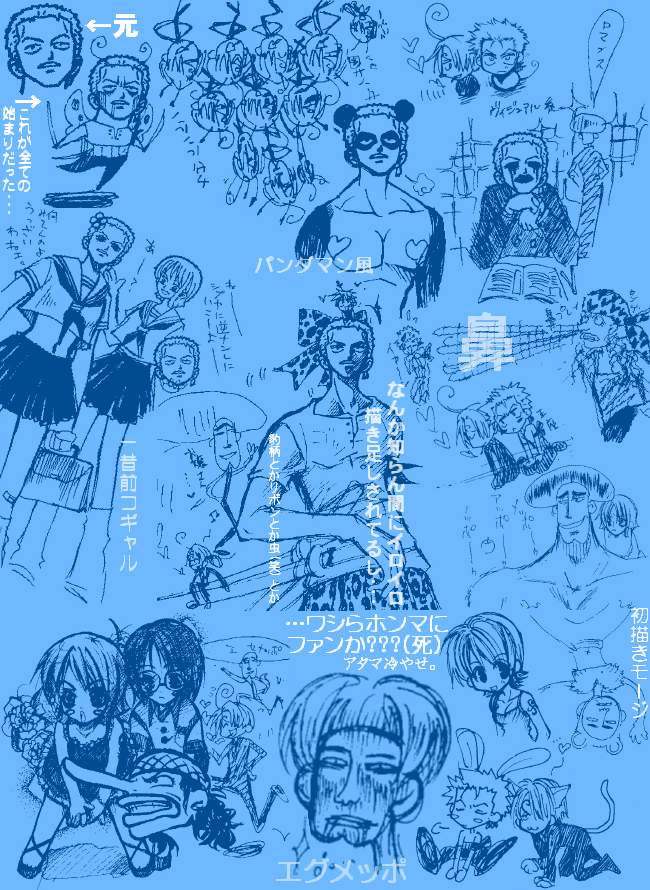 ・・・・・・何て言うの?もうどれが誰が描いたとかそんな野暮なハナシはナシね。 ジャ●プフェスタで売ってたスタンプのゾロで遊ぶ会から始め・・・ 気付けばヘルメッポ怪奇顔特集まで。かいつまんで掲載。 ホントはもっと大量にもっとシャレならんブツもあったりなかったりするけど そこは自粛。3枚分にも及ぶラクガキ集であった。 3人これで1日の精力を使い果たすというヘタレっぷり…。