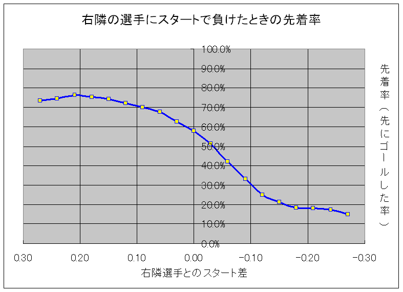 右隣の選手にスタート0.03程度の遅れなら先着率はほぼタイです。