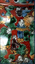 | ◆ 木 米 (MOKUBEI) 九谷焼のページへ 1806年頃、金沢に招かれた青木木米は春日山窯を興した。全面に赤を施し、人物を主に五彩を用いて描き込んだ絵柄が特徴。春日山窯には多くの画風があるが、木米風と呼ばれ伝承されているものは、人物を細く大勢描き、隙間を赤で埋め込んだものが多い。 |