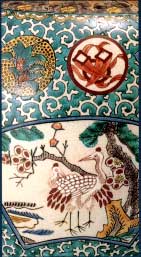 | ◆ 古 九 谷(KOKUTANI) 九谷焼のページへ 1650年頃から1710年頃まで、石川県山中町九谷村で焼かれた色絵磁器を古九谷と呼んでいる。その画風は、大胆な構図、卓越した運筆、鮮やかな色彩、躍動感、どれをとっても他に比べるものがなく、写実性の高いものから、幾何学的文様や抽象的な斬新なもの、また明代の「八種画譜」を真似た図柄など幅広い。 |