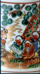 | ◆ 庄 三 (SYOZA) 九谷焼のページへ 1865年頃、古九谷、吉田屋、赤絵、金襴手の全ての技法を学んだ九谷庄三が創案したもので精密、華麗な絵柄が特徴。明治、大正の九谷の代表的な画風。明治維新前後ということから、釉薬にも画風にも、多分に欧州文化の香りが織り込まれている。 |