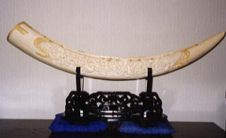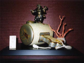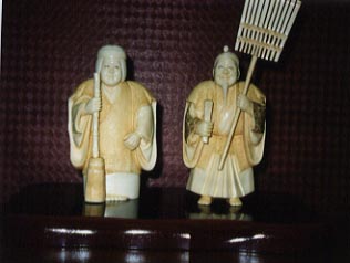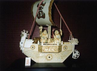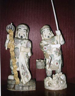 本象牙(彫刻品) ◆七福神彫(五之作) 巾 133 cm 太さ 38.5 cm 重さ12 kg 黒檀天然彫の専用台付 ¥1,850,000- ◆恵比須大黒 (ケース付) 巾 35 cm 高さ 56 cm 左右一対の牙から彫刻した無垢物の希少品 ◆高 砂 (小針信生作) 巾 5 cm 高さ 11 cm 国内で彫刻された逸品。招福開運の神。 ◆恵比須大黒宝船 (中里定之作) 巾 26 cm 高さ30 cm 奥行15 cm サンゴ・金俵・千両箱を積込んだ、富徳の舟が 家庭に福を運び入れます。 ◆福萬来大黒小槌(小針雅生作) 高岡 銅器 大黒天付 彫金装飾・天然枝珊瑚付