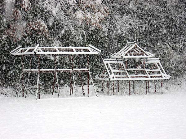 ただ見た目もそんなに痛んではいないようですし、ご紹介の現役時の画像もきれいな状態ですから、両者が同一固体だとすると常設されたものではなく何かの折に皮(?)を装着して使用されるものかもしれませんね。Re: 小谷城戦国歴史資料館 - はらひれ 2014/12/06(Sat) 17:06 No.1601 というわけで小谷城戦国歴史資料館に行ってきました。 資料館の方にお話を伺ったところ、これは年1回開催されるふるさと祭りのときに設置されるミニチュア天守の骨組みで、それ以外の期間はこうして皮を外してこの駐車場奥で保管されるとのことです。 素材は鉄のようですがサビたりしないんですかね。Re: 小谷城戦国歴史資料館 - はらひれ 2014/12/06(Sat) 17:17 No.1603 その骨組みの画像です。 ご覧の通りかなりの積雪で、城址攻略は断念しました。
