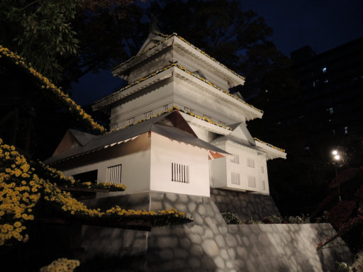 私も昨日行きました - 月の光 2017/11/13(Mon) 22:12 No.1836 時間は17時頃。D-oneさんの近くにいたのかも知れませんね。三島楽寿園はこれで三年連続城物件を作っております。大型盆景の制作スタッフに城マニアがきっといるのでしょうね。 駅の方の入口から入ると、大きな小田原城がありました。これはよく出来ていて、一目で小田原城だぁって物件です。菊は綺麗でしたね。屋根が黄色の菊でライトアップで目立っていました。 奥には箱根の関所。関所を通り抜けた先の菊がたくさん置いてある所に、三島宿の解説板がありました。たぶん、菊がたくさんある長屋状の建物を宿場町に見立てていたのかも知れません。 夜は入園料も無料になっていたので、ちょっとお得感がありました。楽寿園の駐車場は16時で入れなくなっていたので、近くの有料駐車場に入れました。駅の近くなので、30分100円くらいのパーキングがたくさんあるので、困らないと思います。