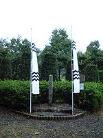 ![]() もはや有名すぎて?訪れた事のある人なら説明は不要かと思いますが、島津公の陣所跡です。神社の脇の道を抜けていって、ちょうど神社の後ろ側にあたる所にありました。そこは小さな林の中で、早朝の雨にぬれていたせいかよりいっそうひっそりとしていました。○に十の紋のついた陣幕がはってあり、石碑が立ててあります。昔も今と同じ感じであるなら、最後の突撃までじっと我慢の守備をするのには良い場所に思える・・。 「おっ!向こうに見えるのは、小西行長の陣所だ・・」 林の切れ目から白い陣幕が見えた。陣所から陣所を見ると距離感が把握できて勉強になりますね。 ------ それでは、この背景を見ながら、絵巻での島津敵中突破の一文を紹介。 (維新) 『 もはやなす術はない。この上は、かしこに見える家康の陣に一気に突入し、いさぎよく死のうぞ 』 (豊久) 『 お待ちくだされ、伯父上。これまで戦わずして命を全うしたのはなんの為でごわす。伯父上が死んでは薩摩はどうなるのでごわすか。今からでも遅くはない。戦線を離脱しましょう 』 (維新) 『 だが逃れる道がどこにあろう。北も西も・・・。いや、あったぞ。敵中を突破して伊勢街道に逃れよう 』 (豊久) 『 よし。・・・いくぞ!遅れるな!目指すは伊勢街道! 』 (ナレ) 一団となって突撃を開始した島津隊。あまりの気迫に東軍の思わず道をよける中を、火の玉のような島津の一団が疾駆し去りました。我に返った東軍諸隊がすかさず後を追って、激しい追激戦が繰り広げられました。この追激戦で島津豊久は戦死。維新ももはやこれまでと覚悟を決め、敵中へ斬り込もうとしますが、重臣・阿多盛淳がおしとどめます。 (盛淳) 『 一軍の将たる人が、討ち死にを急ぐとは沙汰のかぎりでござる。千騎が一騎になるまで、立退かせ給え。恐れ多いことながら、それがしが名代をつかまつりましょうぞ 』 (ナレ) 言い放ってとって返した阿多盛淳は、敵中に駆け込んで・・・ (盛淳) 『 われこそは島津兵庫入道維新なるぞ! 』 (ナレ) 維新の身代わりとなって、討ち死にいたしました。 (ナレ) ようやく島津隊が脱出に成功したとき、1500名の島津隊は80余名になっていたと申します 。 ( 合戦絵巻2000、原文より )
