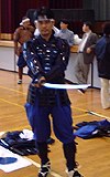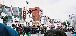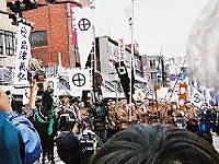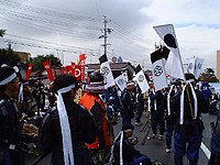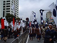 今日は陣笠のかわりに、白のハチマキで出陣するみたいである。この格好も今日が最後なので、色々写真を撮る又五郎。 どうやら刀がもの凄く気に入ったらしい(笑)。 パチン・・パチン・・ 刀をおさめる時の音が聞きたくて、無用に刀を動かす。刀身部分が木?に銀紙を貼った模造刀ではあるが、その他の部分はしっかり作ってある。重量もかなりあった。欲しい・・・(笑)。ちなみに私が刀を使ったもっとも気に入った動作は、あぐらをかいて座り腰から刀を抜いて前に置く一連の動作です。やりながら自己陶酔してました。<おい(^^; 「そういえば、今日の岐阜新聞の1面にカラーで写真がでてましたね」 戸田隊の方が言う。え?1面に?しまった!夕方でも買えるかな・・・(これについては後ほど) --------------- 色々やっているうちに、出陣の時間となった。 大垣まではバスで移動だ。外に出ると雨は殆ど止んでいた。まさにこの行列の為に神が止めてくれたとしか思えないタイミングの良さ。バスの最後席にぶんどり、大垣までの間大将と別れの杯をかわす・・いや会話を楽しんだ。 ![]() 大垣につくと、他の部隊も続々と到着していた。 周りを見渡す。やはり関ヶ原町と違い、大垣は都会だ。槍をバスから下ろして、背旗をくくり準備をしていると、通りすがりの人が珍しそうに見ている。 おもわず・・・ 『 にやり 』 としてしまう(笑)。 ビルの谷間で武者行列。このコントラストがたまらないらしい(笑)。しかし考えたら馬揃えなどは、要するに都市の中心部で「どうだ!凄いでしょ?ぼくたち(^−^」ってやってたようなもんだから、今も昔も武者ってのは目立ちたいものなのだ(笑)。 まず西軍集結の場所で入場行進が行われた。ま、いうなればこれは夕飯前のたこ焼きみたいなものだろう(謎)。一応順番に並んで入場したのだが、観客もそんなに多くなく、入場して指定場所に来ると、みんな隊列を乱してばらばらに入り乱れてしまった。「それでは、ここでしばらく休憩していただきます」お弁当が配られる。期待した『鷹狩おむすび』でなかったのが至極残念だ・・・(;; ![]() ![]() ![]() これがその時の様子でござる! ■上段右が、配られたお弁当を食べる宇喜多隊。 ■真ん中が、「あれ?珍しい旗が行進している・・。ちょっと撮っておこう!」で撮った黄色に黒丸の長宗我部盛親隊(笑)。そういえば昨日は垂井布陣だったし、絵巻では終始傍観だったので覚えてなかったのだ<おい。 ■左は同じ理由で撮った安国寺恵瓊隊。赤に青の旗は珍しいかも・・。ちなみに前の赤に白丸は毛利秀元隊です。 ![]() 戸田隊の面々も昼飯を食べながら、休息をとる。 「暑いですねぇ」 と誰かが言った。時々雲の切れ間から、太陽が差しこんでいる。そう、雨が止んだのはいいが、今度は湿気を含んだ空気がまとわりつくように暑くなってきているようだ。私ら足軽の軽装鎧はまだいいが、大将の重装備は結構きているんじゃないかな・・。夏場にも武者行列があったとしたら、大敵はやはり気温だろう。半端じゃなく暑いとおもう。 「大丈夫ですか?暑くないです?」「え?ああ、まあ・・大丈夫ですよ」 そんな会話を交わしながら、さっきからなかなか始まらない本番を待っていると・・・ なにやら西軍の会場が、ざわざわとざわめき出した。 「ん?なんだ、なんだ」「何がおこるというのだ?」 と思って見ていると、西軍の諸隊が真ん中に集まりだした。どうやら誰か来るらしい。 あ・・・ 琢郎だ・・・・。そうだ琢郎が来るに違いない!<連れかお前は(^^; 「琢郎だ!琢郎が来るぞ〜〜〜〜〜」 思わず叫んで伝令に走りたい気分にかられながら(笑)、来る先をじっと凝視していた。「はっ!( ̄ロ ̄!琢郎ではなく三成だ・・・」と我に返って思いなおす(^^;。周りを見渡すと、西軍の士気が異様に高騰している。皆単なるミーハーなのかもしれないが(というより、殆どそうだと思うが:笑)、そんな事はどうでもよい。総大将の到着というものは、やはり兵を勇気づけるものだ。昔も今も同じだね(^−^b そしてついに・・・ ![]() 我らが総大将 『 石田 辰巳守 三成 』 公、着陣! 「おおっ、三成公・・・」 とっても嬉しそうだ(笑)。そうれはそうだろう、左右に居並ぶ将兵のど真ん中を堂々の入場である。両側に居並ぶ将兵から拍手喝采の嵐。私も我を忘れて、デジカメのシャッターを押した(笑)。 しかし・・・やはり役者がフル装備ででてくると、貫禄あるよなぁ〜。さすがは辰巳琢郎氏。 あっという間に、横をすり抜けていった三成公は、一番前のステージに上がった。 「ではこれより、出陣式をはじめたいと思います」アナウンスが入った。 『 それではこれより勝鬨をあげて出陣いたす。よいかな 』 三成公の掛け声を合図に、「えい!えい!おっー!」の合唱がおこった。 各隊は三成公の着座するステージの前まで行き、Uターンして大垣駅前に向かうという実に「それ」らしい演出で、行進を開始したのであった。 ![]() さて、今回の 『 大垣城東西武者行列 