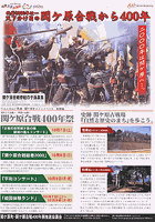■これは、関ヶ原町が作られたチラシです。上記以外に記載されていた事について書いときます(^^■町内施設案内 《 関ヶ原ウォーランド 》 史実に基づいて徳川軍・石田軍の実物大の武将達を配置し、関ヶ原合戦を戦時さながらに再現。 武具や甲冑を展示した合戦資料館もあります。関ヶ原町歴史民族資料館とは別。 ■史跡古戦場ウォークコース紹介 《 せっかちコース 》(1.5時間) 歴史民族資料館 → 笹尾山(石田三成陣跡) → 徳川家康最後陣地(床几場) → 歴史民族資料館 《 ゆったりコース 》(3時間) 歴史民族資料館 → 丸山 → エコフィールド → 笹尾山(石田三成陣跡) → 島津義弘陣跡 → 徳川家康最後陣地(床几場) → 歴史民族資料館 《 のんびりコース 》(6時間) 歴史民族資料館 → 徳川家康最後陣地(床几場) → 丸山 → 笹尾山(石田三成陣跡) → 島津義弘陣跡 → 小西行長陣跡 → 宇喜多秀家陣跡 → 大谷吉継の墓 → 不破関跡 → 福島正則陣跡 → 松尾山(小早川秀秋陣跡) → 西首塚 → 東首塚 → 歴史民族資料館 ---------------------------------------------------------------------- ■同時期に『 決戦関ヶ原大垣博 』(3月25日〜10月9日)も行われてます。 ■最後にアクセスの確認! 《 鉄道 》 『新大阪』 ━━40分(ひかり)━━ 『米原』 ━━30分(東海道本線快速)━━ 『関ヶ原』 ……12分(東海道本線快速)…… 『大垣』 『東京』 ━━96分(のぞみ)━━ 『名古屋』 ━━30分(東海道本線快速)━━ 『大垣』 ……12分(東海道本線快速)…… 『関ヶ原』 《 自動車 》 名神高速『関ヶ原IC』を降りて365号線を北上、車で5分 --- 皆さんも、関ヶ原400周年記念イベントを楽しんでみませんか(^^