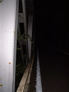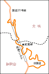 さて・・・とりあえず飯(晩飯代わり)におむすびを食べることにした。 「ここからがいよいよだな・・・」 歩道橋の階段に座り飯をほおばりながら、これからの峠越えに思いをめぐらす。 ここで簡単に説明すると、この紀見峠、一昔前までは国道が山沿いに作られ、山を越えるかたちの道がメインの371号線であった(推測)。しかし、最近紀見トンネルができてからは、トンネル一直線で山向こうに抜けられるようになっている。で、このトンネルである。一応トンネル内には歩道が設けられているので、歩く事はできるのだが・・・ イマナラマダトンネルヲセンタクスルコトハデキルケド・・・ 迷いが出た。というのも、この旧371号、前に車で下見したのだが、結構コワイのだ(笑)もちろん昼間は木々に囲まれた山道なのだが、調べたところでは外灯は無かったので多分真っ暗。途中猪とかでたらいやだな・・ なんて一瞬思ったりもしたわけだけど、やっぱり紀見峠「越え」なのであって、紀見峠「くぐり」ではない(笑) ここで、とある真田草のものTさんに電話。 「峠を前にして急に誰かの声が聞きたくなったので、電話しました」 忍びの習性として「任務は極秘にすみやかに」なのに、俺はまだまだ甘いちゃんだよなぁ(笑) 夜の信濃の山中を一人で一晩中走り回るお江はやっぱりすごいや・・・