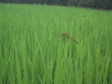 ●田んぼにとんぼ 稲の先が黒っぽいなあ、と思って見ると、トンボがたくさん止まっていました。