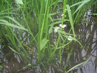 ●オモダカ 今日は、田んぼの草取り。このオモダカって、葉っぱはキツネの顔みたいで、白い花が咲いて、とてもかわいい。でも田んぼでは困りもので、花が咲くとどんどん増えるから、早く抜かないといけないらしい。