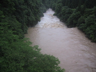 ●成瀬川夕方、成瀬川を見に行ったらびっくり。こんな濁流になっていました。本当は、ここには堰堤があって、その下で東さんが岩魚を釣ったところです。