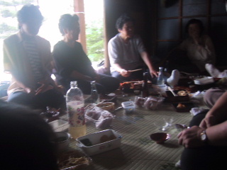 ●虫祭り神社で虫祭りでした。神主さんのお祓いが終わった後、みんながご馳走を出してきた。サツマイモや干し柿の天ぷら、キュウリやカブの漬物、お赤飯、胡桃入りのおこわ、いなり寿司などなど。