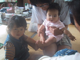 ●足比べはあとちゃんが遊びにきました。春がはあとちゃんと自分の足の大きさを比べて見ている。春の足が大きく見えた。