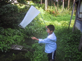 夏休みで、ハルキがお父さんと遊びにきました。さっそく裏の池でイモリを捕まえた。