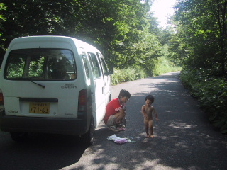 ●裸の子クネクネ道を車で上っていたら、春が酔って吐いてしまいました。車を止めて、服を脱がせたら、とたんに元気になって走り回ってる。