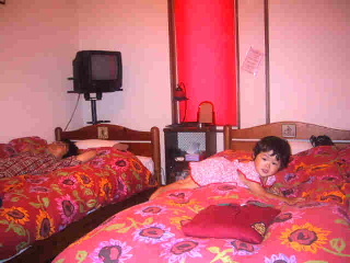 ●ベッドで寝るの杉山家がこんなかわいらしい部屋にいるなんて、どうしたのでしょう。ある人が村のペンション「きのこ小舎」の宿泊券をプレゼントしてくれて、それで今日は泊まりに来たのです。