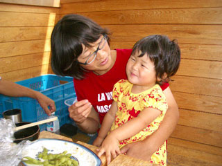 この日はみんなでドライブ。途中、道の駅に寄って、あおいの作ったお弁当で昼ごはん。イワナの入った玄米おむすび、卵焼き、枝豆(もちろん杉山家が育てた枝豆)などを食べて、春ちゃんも満足。
