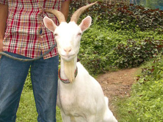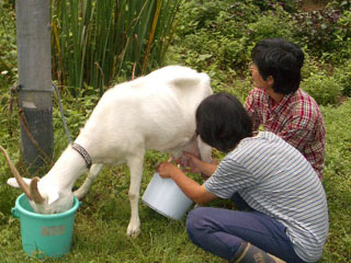 これは朝の日課、モモちゃんの乳しぼり風景。以前は特製の台に固定して搾乳していましたが、もうその必要はないとのこと。ヒモ1本でつないでエサ(この日はオカラ)をやれば、じっとしていてくれます。