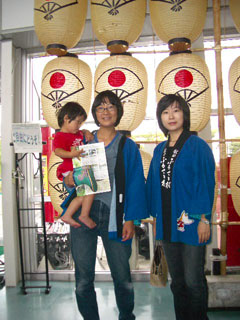 竿燈まつりのちょうちんをバックに、お揃いのはっぴを借りて記念撮影。