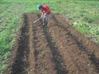 ●大根の畝を作るイモを掘った後に、大根の種をまくために畝を作る。みんなとっくに大根の種をまいていて、早くしなきゃ、と思っていたものです。