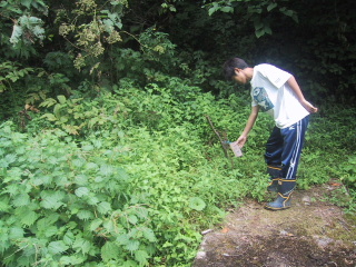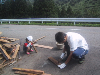 ●釘たたきリョウ君がやってきました。さっそく働かせている。薪にするためにもらった板の釘を叩いています。