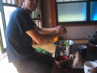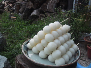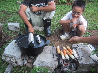 ●炭火で焼きながら外で座って、お団子を炭火で焼きました。途中でしょう油をぬって、さらに焼いて、ちょっとこげたところを熱々を食べる。おいしかった。