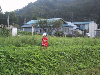 ●帽子の春春はけっこう帽子好き。でもちょうど良い大きさの帽子が見つからないので、いつもちょっと小さい帽子を自分でおしゃれに(?)かぶっている。1人で畑のわきを歩いています。