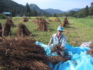 ●ソバ叩き干していたソバが乾いたので、たたきました。よく乾いていて、バラバラ落ちる。
