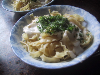 ●クリームスパゲティヤギ乳でホワイトソースを作ったら、それなりにおいしくできました。上に人参の葉っぱを刻んで乗せた。何でもスパゲティにすればおいしいから、パスタの自給ができたらいいのに、といつも思ってしまいます。