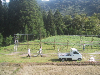 ●家の前の稲架(ハサ)家の前の牧草地にハセを作っています。下の集落の人がやっている。午後になったら、刈り取られた稲が次々運び込まれて、ハサにかけていた。この家の稲刈りは毎年、村で一番早いくらい。