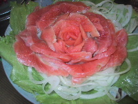 ●アマゴのルイベろくさんがご馳走を色々用意していました。岩魚ご飯、鮎や野菜の天ぷら、卵焼き、ミルク寒などなど。写真はアマゴのルイベ。お花のように飾ってある。
