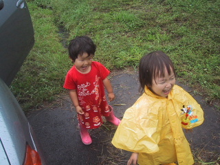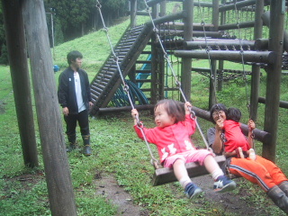 ●ブランコ雨で濡れたブランコでみんなで遊びました。ヒナちゃんは怖くないらしい、高く高くこいでいた。春は怖くて、ダッコ。