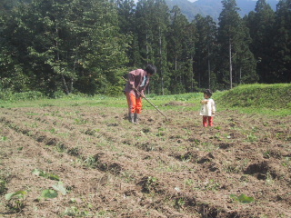●小麦まき今日は、麦をまきました。管理機で表面を耕しただけなので、草が多いところに、苦労して麦をまいた。種に土をかぶせているところ。春は鼻血を出して、「チガーチガー」と泣いていました。