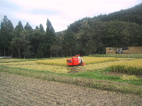●隣の田んぼでは隣の田んぼでは、コンバインが働いています。私たちがノロノロ、ハセを作っている間にあっという間に広い田んぼを刈ってしまっていました。