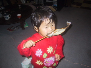 須川温泉で、岩魚を売っているろくさんが、売れ残ると持ってきてくれます。気が付くと、春がもうかぶりついていた。