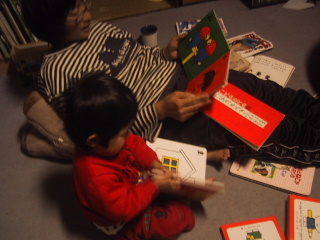 夜は、2人で座って絵本を読んでいます。私は楽しくマンガを読んでいたのだけど、春に「かーちゃんは、これよむ」と強制されて、ブルーナのあいうえおの本を読んでいます。「や・やね」とか。