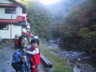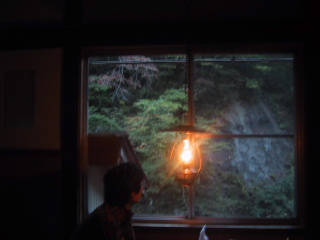 今夜は、父母、こうちゃ姉ちゃんとランプの宿に一泊。ブナ林の中を20分ほど歩いたところにある渓流沿いの温泉です。