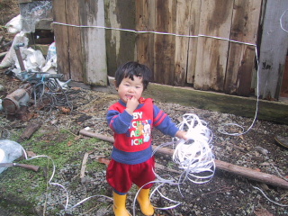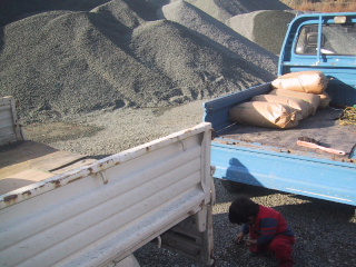 砕石の工場で、小麦をくれるという人がいたのでもらいにいきました。トラックから自分の軽トラに移している間、春は石で遊んでいた。