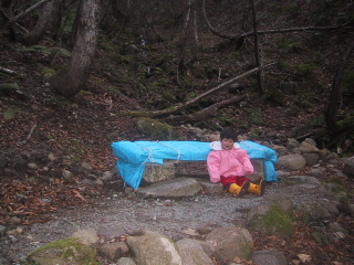 帰りは急な階段ののぼりなので、ベンチで休憩。ベンチはもう雪の準備でシートに覆われていました。春はベンチの下の石に座っている。