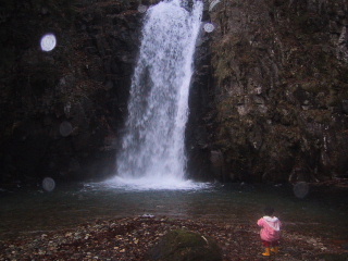 鶏エサ回収の途中で、天正の滝に寄りました。水しぶきがここまで飛んでくる。