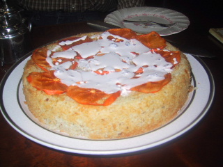 オリジナルの柿のケーキをごちそうしてくれました。上に薄く切って乾燥させた柿をたくさん飾って、生地には干し柿が入って、優しい甘さになっています。そこにクリームをたくさんかけて食べるの。