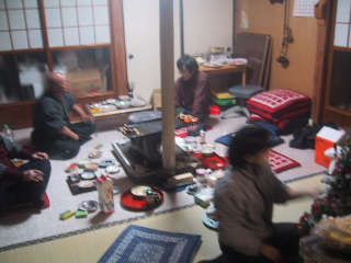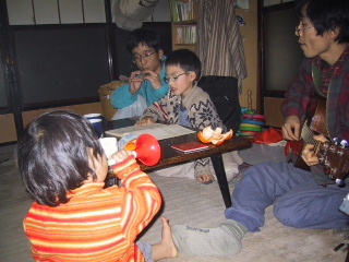 ●合奏 食後はやす君の歌集を見ながら、みんなで「あわてんぼうのサンタクロース」などを歌いました。彰はギター、途中から及川さんはコカリナ、春はラッパで参加。